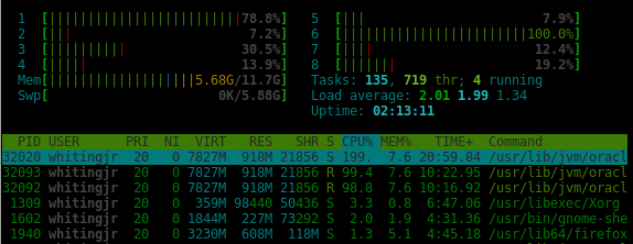 HTOP显示两个核心几乎固定在100%。
