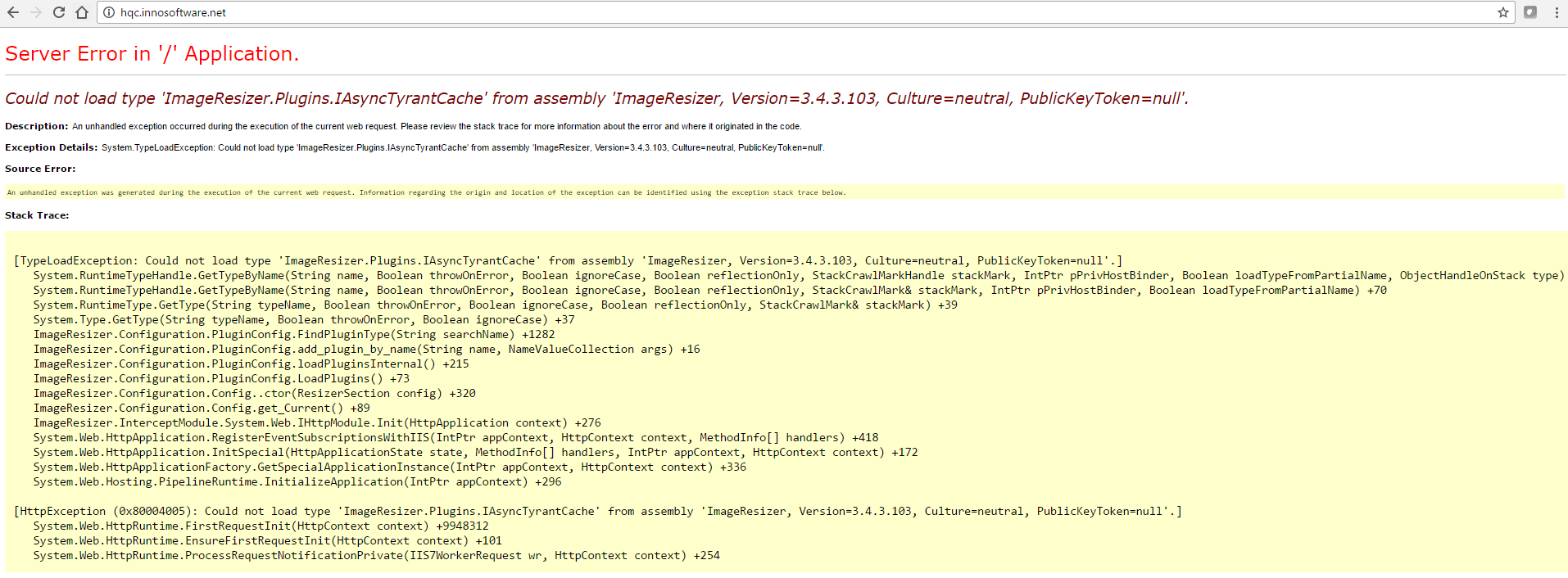 所以ImageResizer DLL有问题。也许您已经安装了imageresizer,或者您可能已经安装了其他imageresizer DLL (可能是缓存帮助程序),它们仍然在DLL文件夹中,但现在出现了版本冲突。最好删除所有不在2sxc-zip中的ImageResizer all。如果你真的需要它们(也许你有一个水渍或什么的),得到相应的版本。