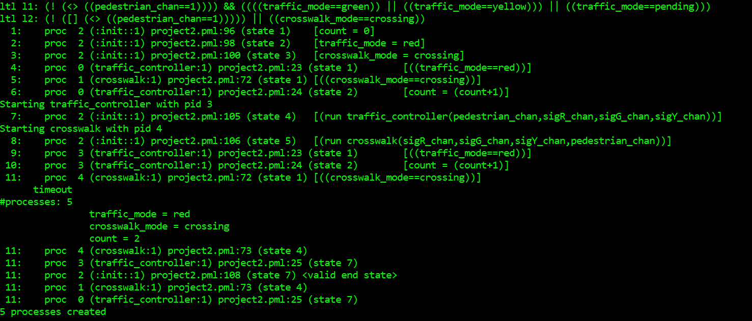 我正在研究一个promela模型,它非常简单。它使用两个不同的模块,充当人行横道/交通灯。第一个模块是输出当前信号的交通灯(绿色、红色、黄色、挂起)。该模块还接收一个称为“行人”的信号作为输入,该信号作为一个指示符,表示有行人想要过马路。第二个模块充当人行横道。它接收来自交通灯模块(绿色、黄色、绿色)的输出信号。它将行人信号输出到交通灯模块。这个模块简单地定义了行人是否在过路、等待或不存在。我的问题是,在运行模型的旋转,它超时,一旦人行横道开始脚趾执行其最初的几个语句。我已经附加了从命令行接收到的跟踪的图像。我对Spin和Promela完全陌生,所以我不完全确定如何使用跟踪中的信息来在代码中找到我的问题。任何帮助都是非常感谢的。