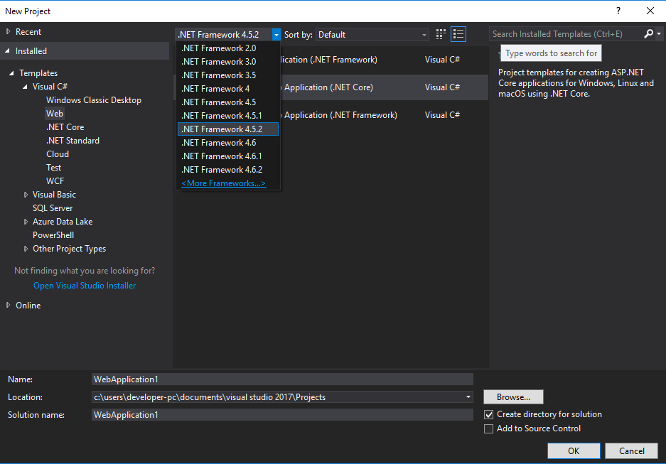 关于为什么在创建.net核心项目时不能“瞄准”框架。如果你愿意的话,这是一个已知的"bug“。或者更多,以便在创建.net核心项目时,下拉列表是多余的。它只需在您的计算机上使用.net核心SDK的最新版本(默认情况下)。