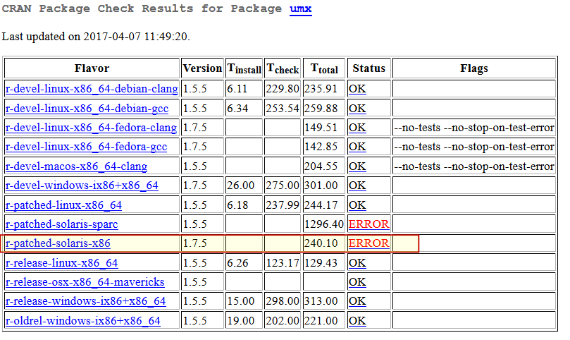 不过,请记住,从源代码安装并不总是一个明智的想法。您至少应该检查CRAN上的包的检查结果。在这种情况下,版本1.7.5似乎会导致问题,如umx.html上不同版本的CRAN结果所示