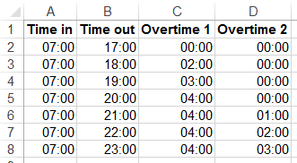 然后减去两者,得到一天的分数,乘以24,转换为小时,然后减去8,得到overtime1小时。组合成一个超级公式,在C1中如下所示: