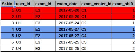 我有一个表的结构,如下图所示。基本上,它有像u1、u2这样的用户in,他们将在给定的日期在给定的考试中心/地点进行E1、E2等考试,比如shift 1,shift 2等。一天最多有4班,轮班数不多。从1到4。
