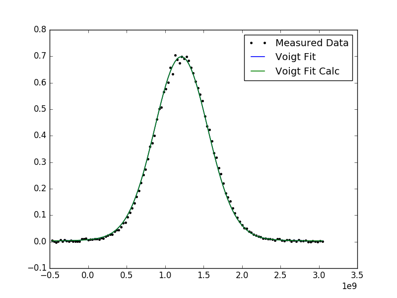 plt.plot(absPlot[50:170, 0], yValTest, linewidth=1.2, label='Voigt Fit Calc')问题是你们比较了不同的范围。修复后,该地块看起来像预期的那样(蓝色和绿色无法区分;我在下面添加了另一个测试):