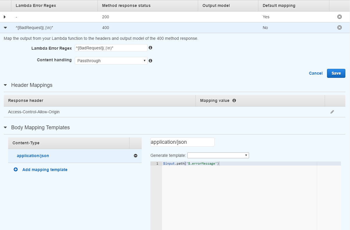 在这一点上,我不知道为什么它仍然不能返回正确的响应。我查看了有关这方面的各种帖子(包括:Is there a way to change the http status codes returned by Amazon API Gateway?和How to return error collection/object from AWS Lambda function and map to AWS API Gateway response code),并阅读了文档。