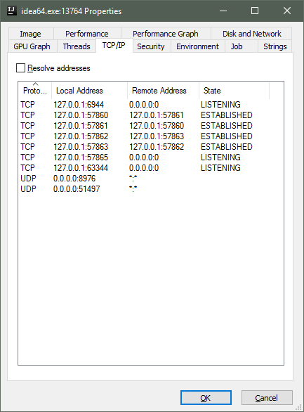 默认情况下,IntelliJ IDEA不绑定通配符接口上的任何端口,除了UDP并发许可检查(仅用于最终授权)。用于内部需要的所有端口(Netty库初始化、独占文件夹锁定、内置web服务器、调试器、编译器/maven/gradle/运行process )都是在localhost (127.0.0.1)接口上打开的: