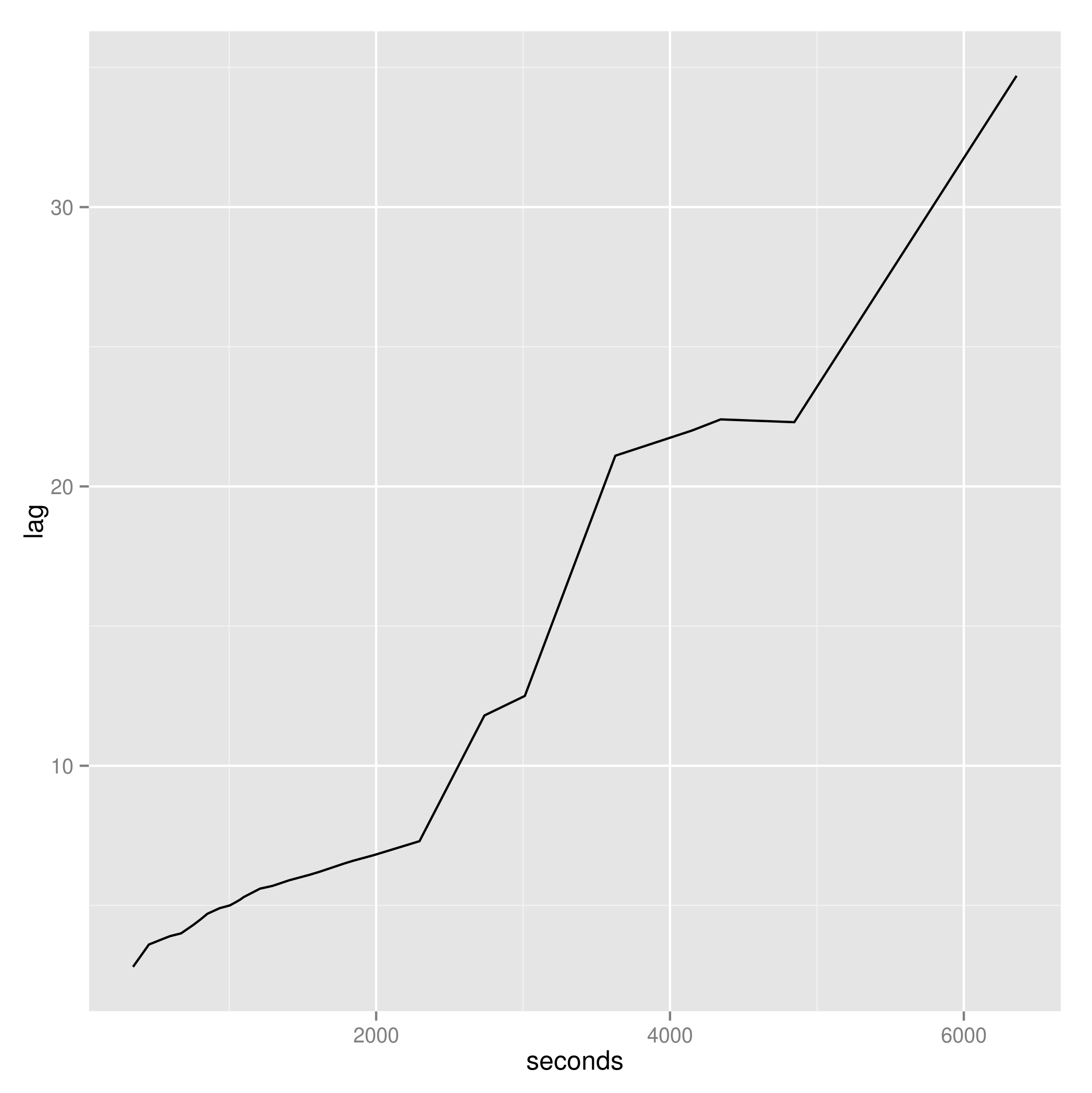 当我将音频和视频组合回一起(目前使用ffmpeg在MKV容器中生成mp4(v) mp3(a) )时,音频和视频开始同步,但是越来越多地漂移,直到它结束于大约35秒。最糟糕的是音频滞后是非线性的!所谓非线性,我的意思是,如果我用时间滞后的位置绘制滞后图,我没有得到一条线,但是你在下面的图像中看到了什么)。由于这种非线性,我不能只是移动或缩放音频来适应视频。我无法找出这种非线性增加的音频延迟的原因;我已经双倍和三倍地验证了我的数学。