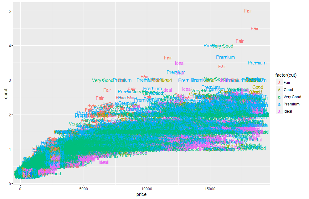 ggplot(diamonds, aes(x=price, y=carat, colour=factor(cut), label=factor(cut))) +