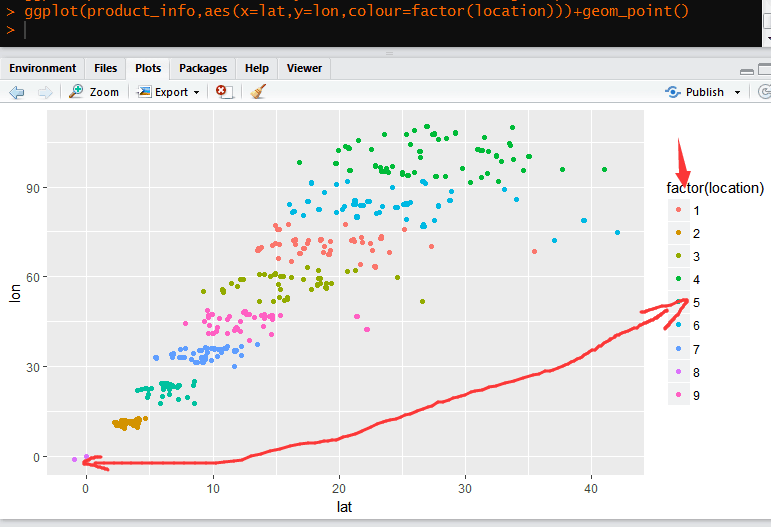 我使用了代码ggplot(product_info,aes(x=lat,y=lon,colour=factor(location)))+geom_point(),如下图所示