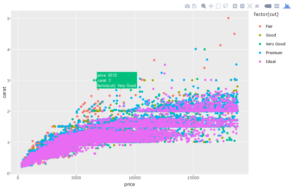 p <- ggplot(diamonds, aes(x=price, y=carat, colour=factor(cut)))