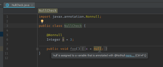 此页来自IntelliJ明确指出"IntelliJ的想法突出了问题“,所以您可以在编辑器中看到检查结果。我甚至将示例代码(public class TestNullable)复制到我的编辑器中,它不会产生任何错误。