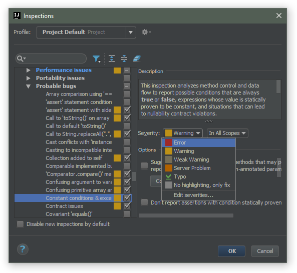 您还可以更改检查的严重程度(例如出错):