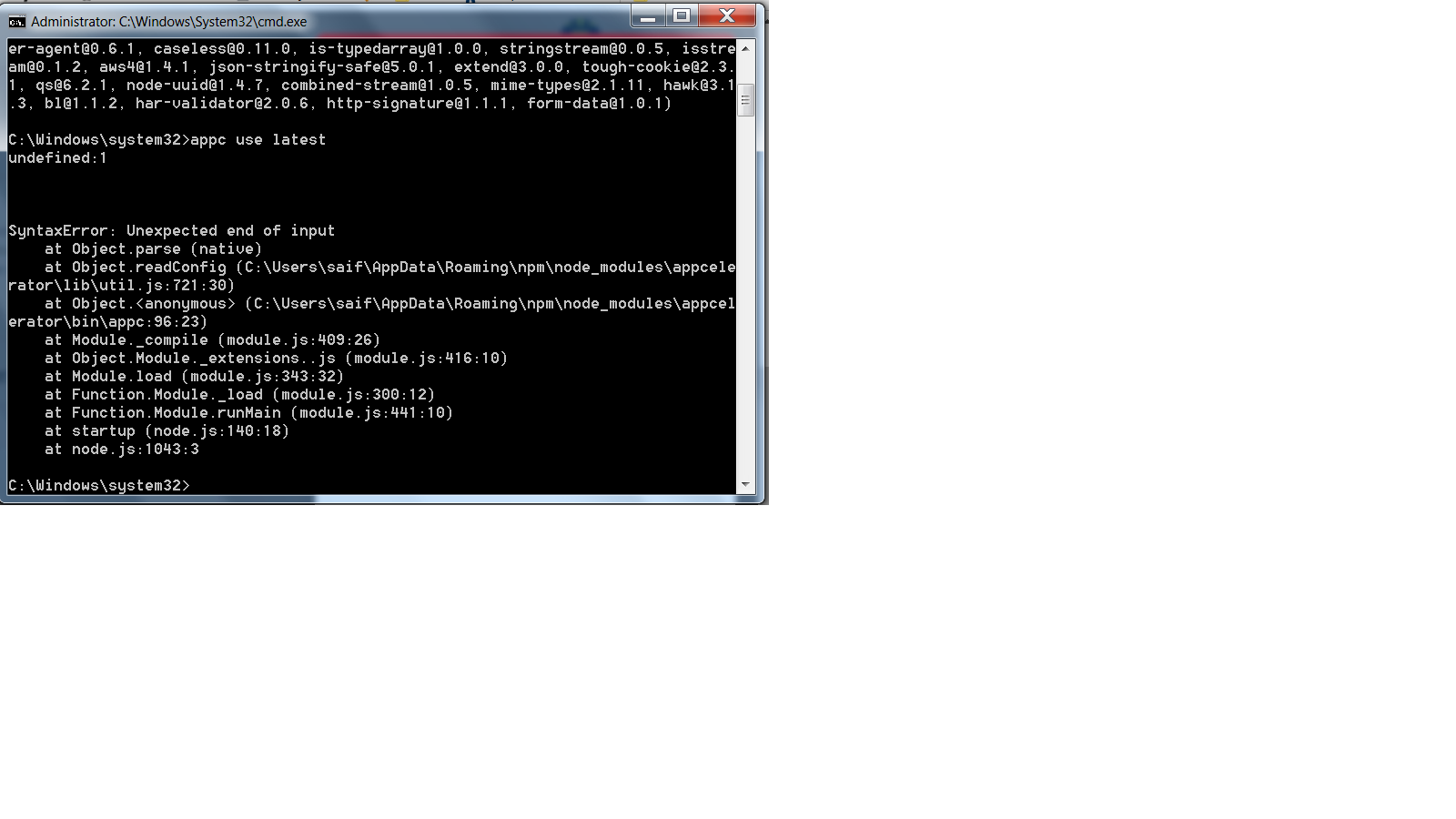 在步骤3,即在运行命令appc use latest时,管理命令提示符正在抛出错误Unexpected end of input,请参考图像