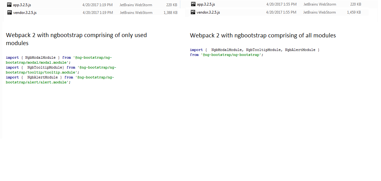 此外,在使用WebPack时,请确保只导入它在vendor.ts文件中使用的内容(因为import '@ng-bootstrap/ng-bootstrap';将带来所有组件);