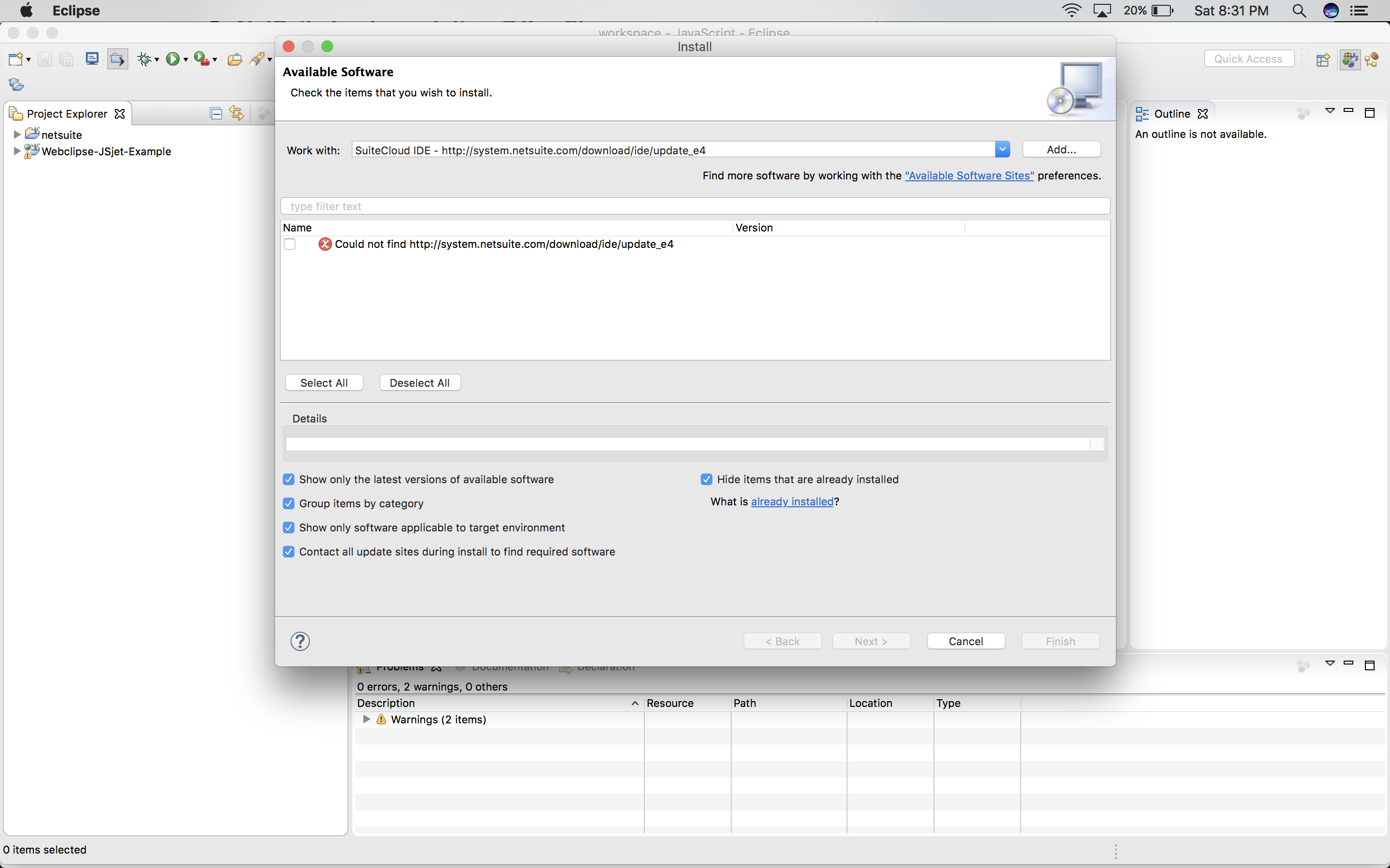 当我试图在SuiteCloud设备上安装Eclipse时,我得到了以下错误: