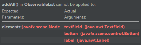 我有一个小问题,当我想将textField、按钮和标签添加到VBOX时,我有一个错误: addAll()在ObservableList中无法应用于: