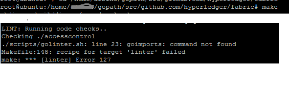 当我构建make the hyperledger fabric项目时,我有下面的error.but,我已经成功地安装了goimport。为了找出原因,我单独运行./scripts/golinter.sh,而没有这样的error.what是错误的原因,当我完成整个fabric项目时。