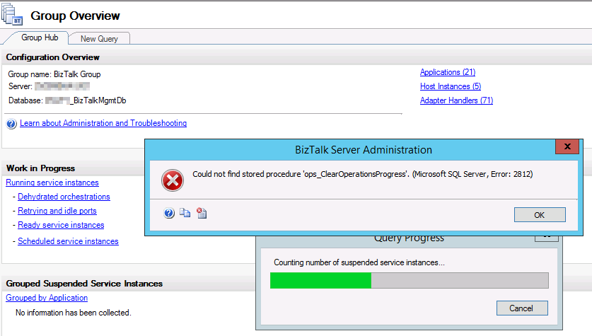 当您尝试打开BizTalk管理控制台时,您将屏蔽一个“未能找到存储过程ops_ClearOperationsProgress”异常。