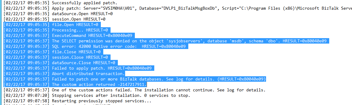 在没有所需的SQL管理权限的情况下安装BizTalk 2013R2 CU5存在一个问题(根据我的意见,安装程序不会以它应该的方式通知它)。