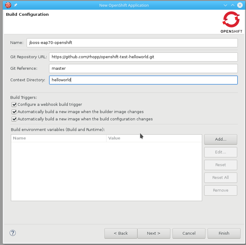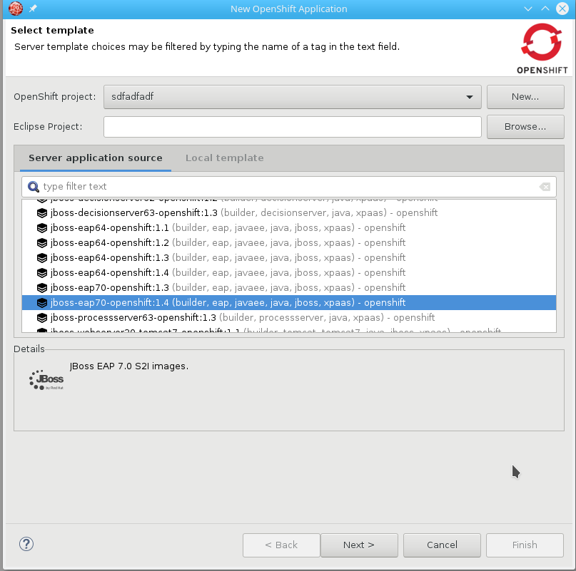 2)在新建OpenShift应用程序向导的第一页上,选择所需的构建器映像(我使用了jboss-eap70-openshift:1:4)