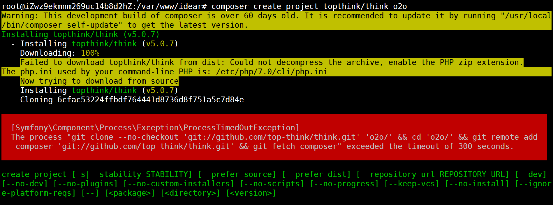 composer create-project topthink/think o2o远程服务器抛出此警告和错误: