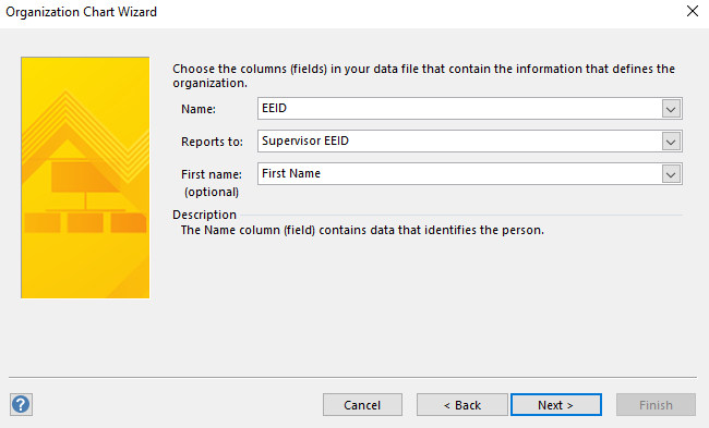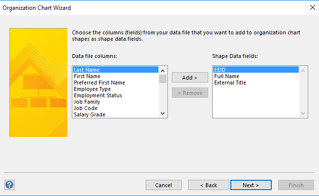 我正在使用组织结构图向导自动创建一个组织结构图作为起点(它非常大)。在这样做时,我使用" name“和"reports to”字段中的两个数字字段,因为我们有同名的雇员。但是,我不希望这些数字字段显示在组织结构图形状中。您可以在第二张图片中看到,我无法从选定的“形状数据字段”中删除三个默认字段。