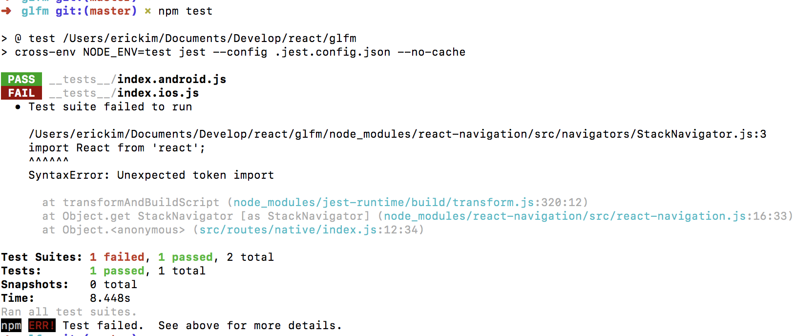 问题是节点不理解ES6模块,JEST是节点进程,因此使用测试内部的import抛出此错误。我们没有专门告诉Webpack要翻译ES6 modules.So,我们可以通过告诉babel在测试场景中使用下面的babel配置设置来组合ES6模块来修复这个错误。