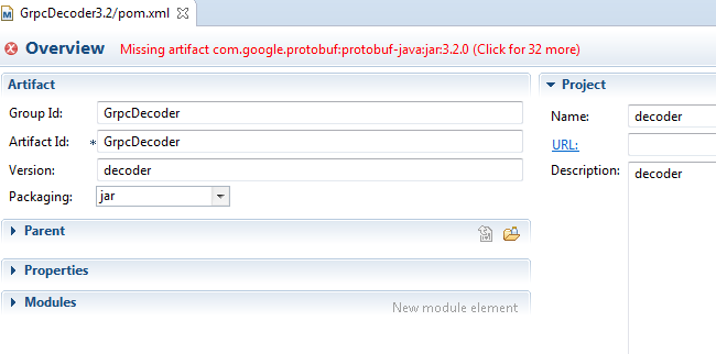 我使用Proc3.2编译器编译了我的Protoc文件。当我试图将它与下面所示的maven依赖关系一起使用时,POM文件会给我带来错误,并且所有的依赖项都没有被解析。想知道grpc的正确版本是什么--我应该使用的全部内容都与用protoc编译器3.2.0生成的Java代码兼容