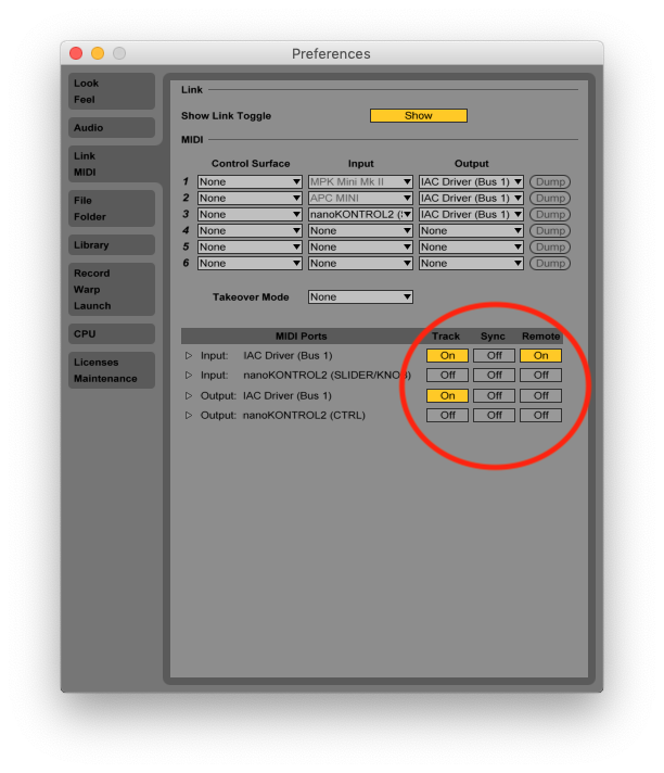 2)前往Ableton -> Preferences -> MIDI。在底部输入: IAC驱动器(总线1)‘启用’跟踪‘和’远程‘。用于“输出: IAC驱动器(1总线)”启用“跟踪”。