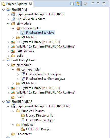在这里,您将发现由EJB实现的业务接口,您可以将这些接口打包并分发给您的客户端,无论是远程的还是本地的。同样,ejbModule是所有类的位置。另外,我不知道为什么Eclipse将其创建为一个EJB项目,一个Jar就足够了。