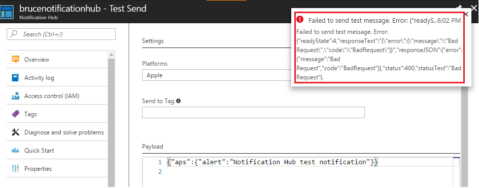 根据您的描述,我在Azure门户上测试了向我的移动平台发送测试消息,配置了Windows通知服务(WNS),然后我可以成功地将测试消息发送到我的UWP应用程序中。在向Apple平台发送消息时,可能会遇到以下相同的错误:
