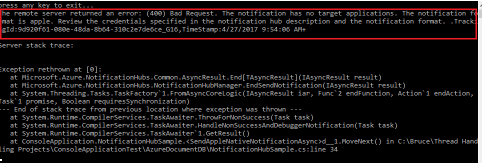 我通过Azure门户向移动平台发送通知。Windows和Android平台上没有问题,但我无法向IOS平台发送4天通知,我收到了此错误
