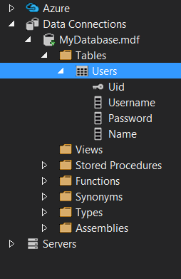 我在Visual 2015中创建了名为Users的简单数据库表,并对其进行了更新。