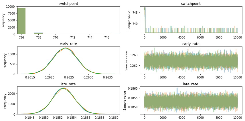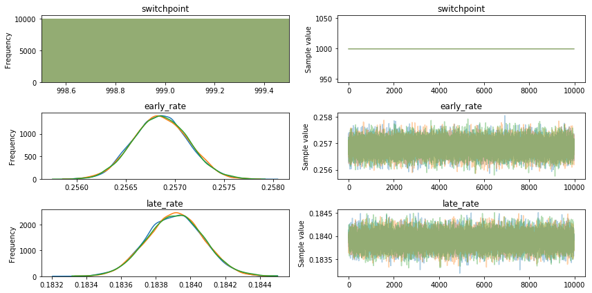 y = pm.Binomial('y', p=p, n=df['trials'].values, observed=df['successes'].values)它似乎运行得很好,只是它完全以开关点(999)的一个值为中心,如下所示。