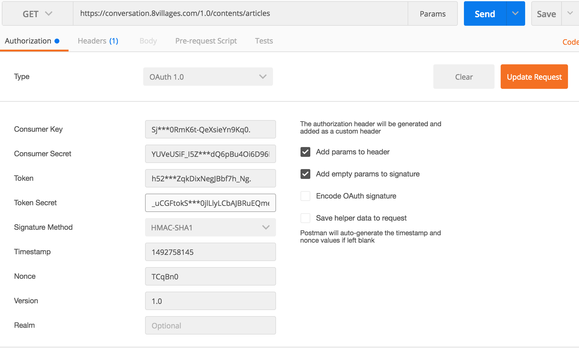 我有消费者密钥,消费者秘密,令牌密钥和令牌秘密来获取数据API。邮递员就是这样的: