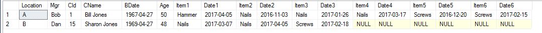 B Dan 15 Sharon Jones 1969-04-27 48 Nails 2017-04-05 Nails 2017-03-07 .... ..。从本质上说,每一个CId都有一行: Location,Mgr,CId,CName,BDate,Age,Item1,Date1,Item2,Date2,Item3,Date3 .多达6件购买的物品。