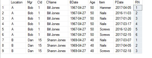注意最后一列RN。您可能会看到,它是增量式的,但由Location, Mgr, CId, CName, BDate, Age分区,由Item,PDate命令。