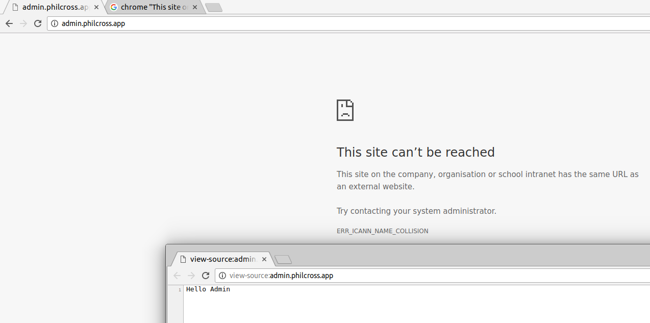 如果我去philcross.app,它就能工作。我看到网页了。如果我去admin.philcross.app,它失败了,告诉人们有一个ICANN碰撞。然而,如果我查看源,我会看到我的网页来源。不是错误源。