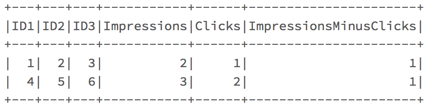 df = sc.parallelize([(1, 2, 3, '2','1','1'), (4, 5, 6, '3','2','1')]).toDF(['ID1', 'ID2', 'ID3','Impressions','Clicks','ImpressionsMinusClicks'])