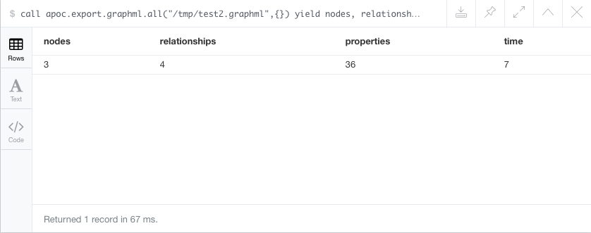 call apoc.export.graphml.all("/tmp/test2.graphml",{}) yield nodes, relationships, properties, time这是来自Neo4j浏览器的快照