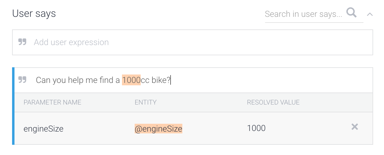 我是API.AI新手,已经设置了我的实体及其同义词、意图和用户表达式,以及对实体的引用(@engineSize,@make,@bikeType)。