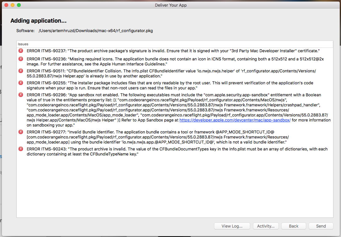 我想签署我的应用程序,以摆脱应用程序阻塞与根据安全。我遵循了官方的NW.js文档Mac-App-Store-(MAS)-提交指南生成的证书,打包了我的应用程序,签了名。但在签约后,我的应用程序在发布后立即关闭。当我试图通过模板加载程序将这个签名的应用上传到应用商店时,我得到了: