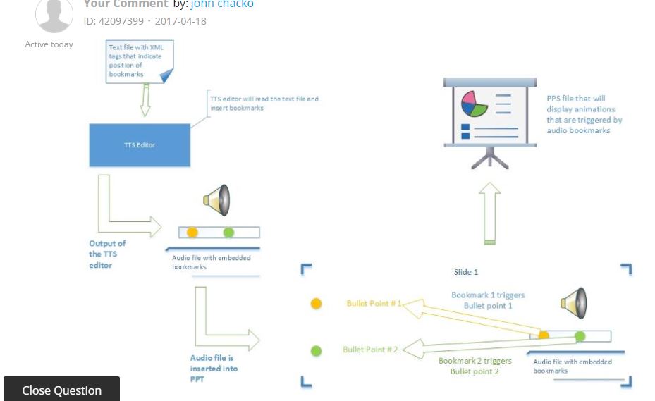 我的教授想要自动化的过程,通过我们同步的子弹点上的功率点幻灯片和书签在音频文件。如果我们可以创建遵循命名约定的音频书签标记(例如,BM__ ),那么VB脚本可以将音频书签链接/同步到幻灯片x、y或x上的项目点。