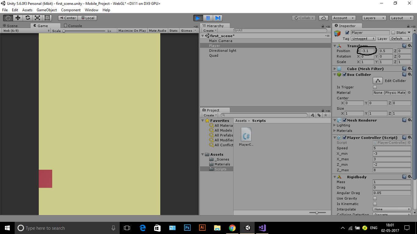 我的游戏场景中有一个魔方(玩家)。我编写了一个C#脚本来限制立方体的移动(使用Mathf.Clamp()),这样它就不会离开屏幕。