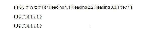 首先,我尝试使用Insert > Quick > Field输入它们。Word创建了类似于字段代码的内容,但它的行为像普通文本一样。干扰各种控件切换字段显示和隐藏文本等,绝对没有效果。它基本上是一个人造的领域。当然,在编制TOC时,这是完全被忽略的。