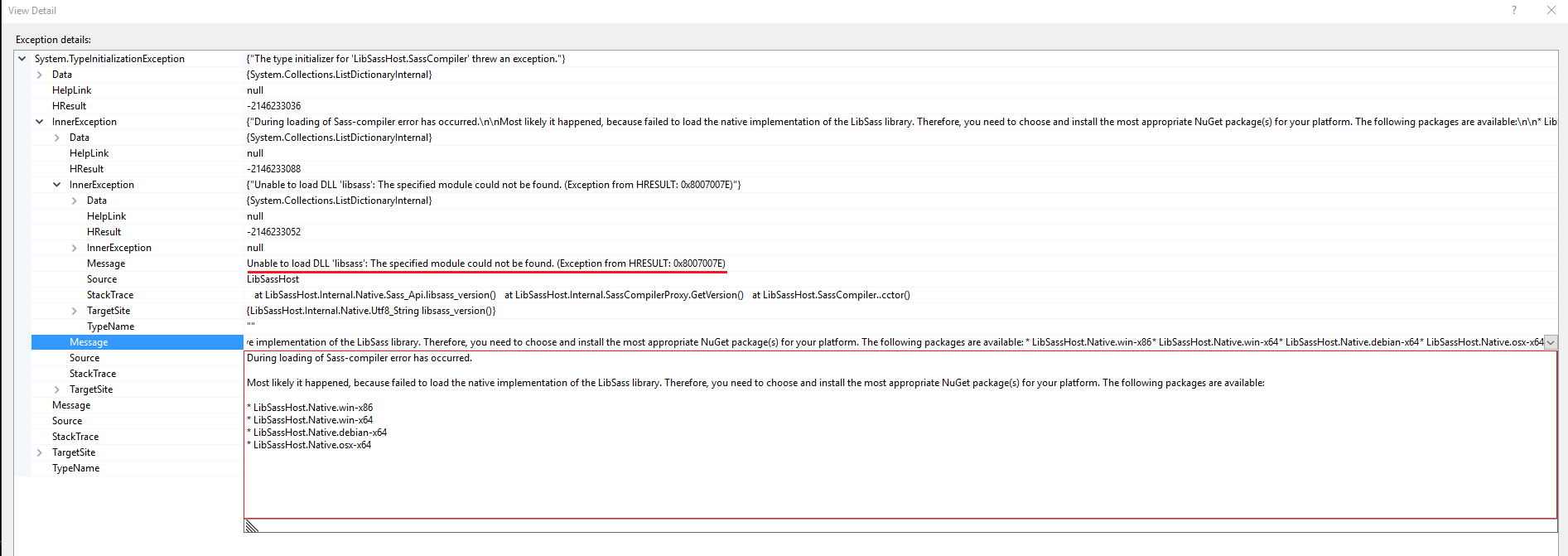 嗯,试了一会儿之后,我刚刚安装了LibSassHost.Native.win-x86,它成功了。