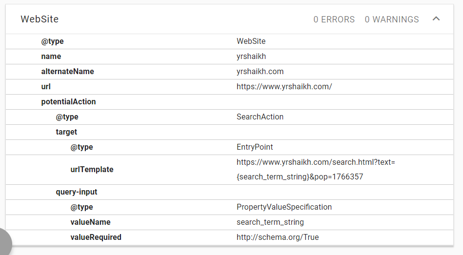 当我在谷歌上搜索我的域名时,我确实看到了一个Sitelinks搜索框,但是当我输入一个搜索词并进行搜索时,它不会用搜索词重定向到我的目标url,而是通过whatever-search-term site:yrshaikh.com在Google中搜索。