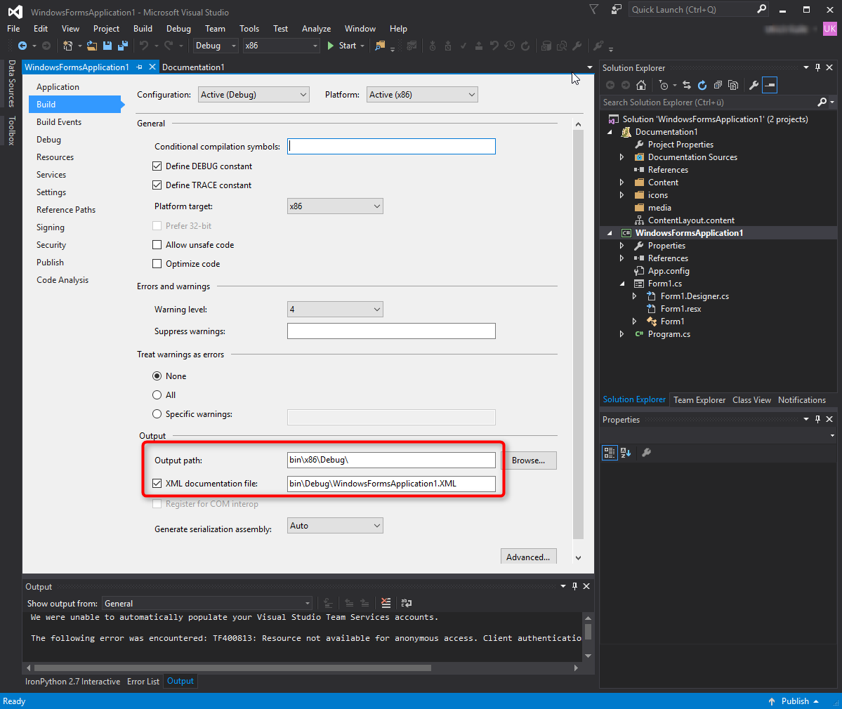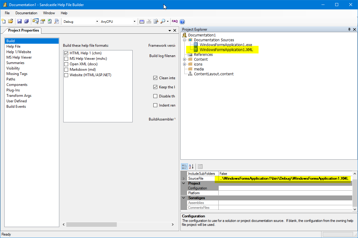 我正在使用(SHFB) GUI为Microsoft 2013中的C#项目构建文档。在Properties中,输出路径被设置为"bin\x86\Debug\",但是当我在SHFB中构建沙堡帮助文件时,有一个