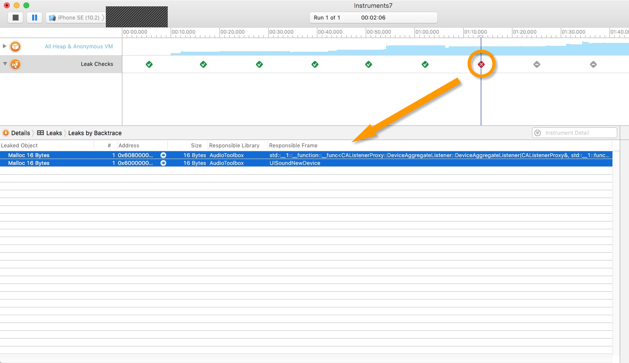 self.run(audioMatchAction)考虑到所有情况,有迹象表明当视图控制器(UIViewController)设置场景时,内存可能会泄漏。因此,我使用了分配来查看发生了什么。它说有两个指向AudioToolbox库的漏洞。不管怎么说,我已经把上面的线改成了下面的一行。