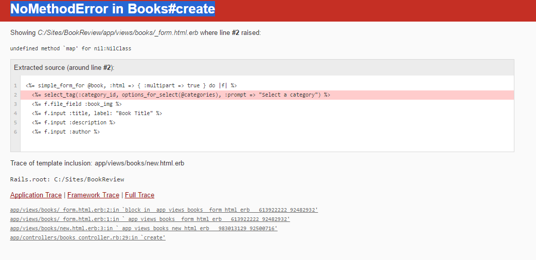 end如果create操作失败,它将呈现new模板,该模板尝试在@categories变量中填充可用类别的选择标记。该变量仅在new操作中设置。
